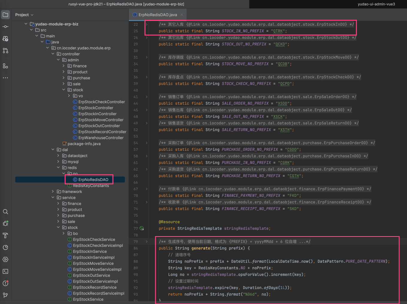 ① no:入库单号,一般是系统自动生成的,目前格式是 {prefix}{yyyyMMdd}{6 位自增}。具体可见 ErpNoRedisDAO 类,如下图所示: