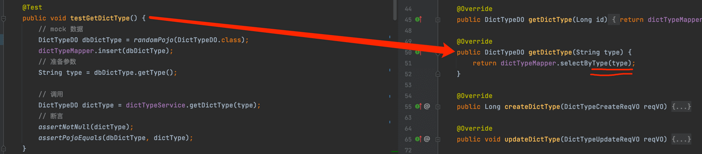 • dictTypeMapper 某种程度来说,也是一种外部依赖,但是通过内嵌的 H2 内存数据库,进行“真实”的数据库操作,反而单元测试的编写效率更高,效果更好,所以不需要 Mock 掉。